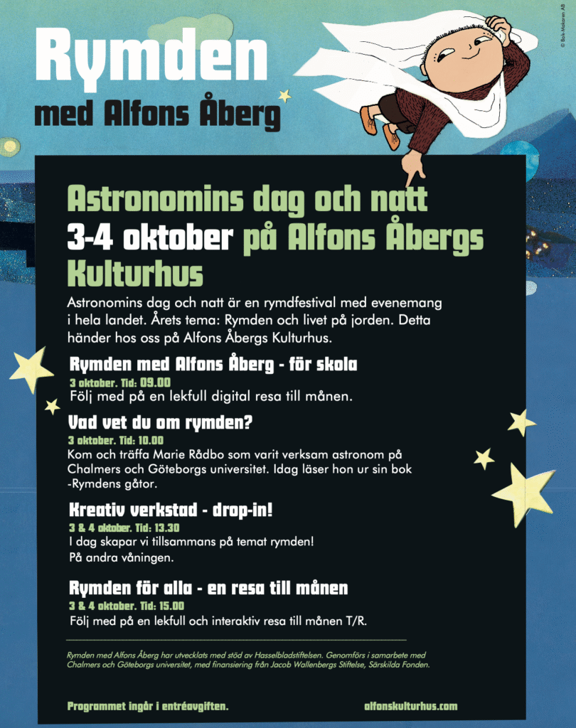 Följ med på en digital lekfull och interaktiv resa till månen. I samband med Astronomins dag och natt bjuder vi in till en alldeles speciell rymdupplevelse. I år är det 56 år sedan den första månlandningen och snart är det dags igen. Den 3 oktober kan du som anmäler dig få följa med (Neil Armstrong, Buzz Aldrin, Michael Collins och Alfons Åberg) på en resa till månen tillsammans med forskare och studenter från Chalmers samt skådespelare på Alfons Åbergs Kulturhus – helt utan avgift.